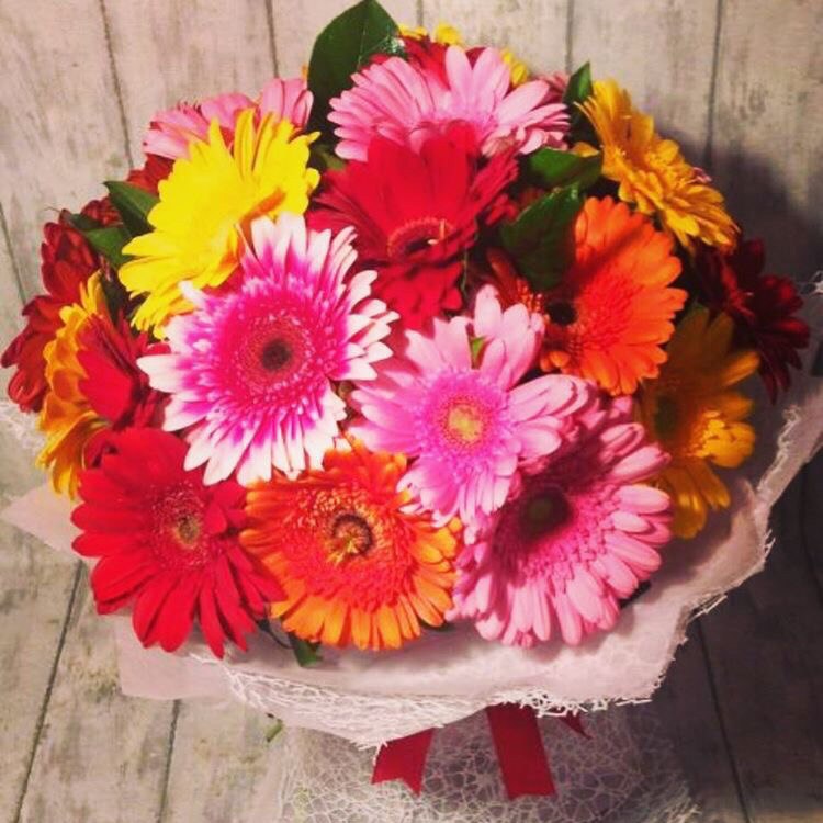 Высота стебля гербер 60 см, кол-во в букете 23 шт.